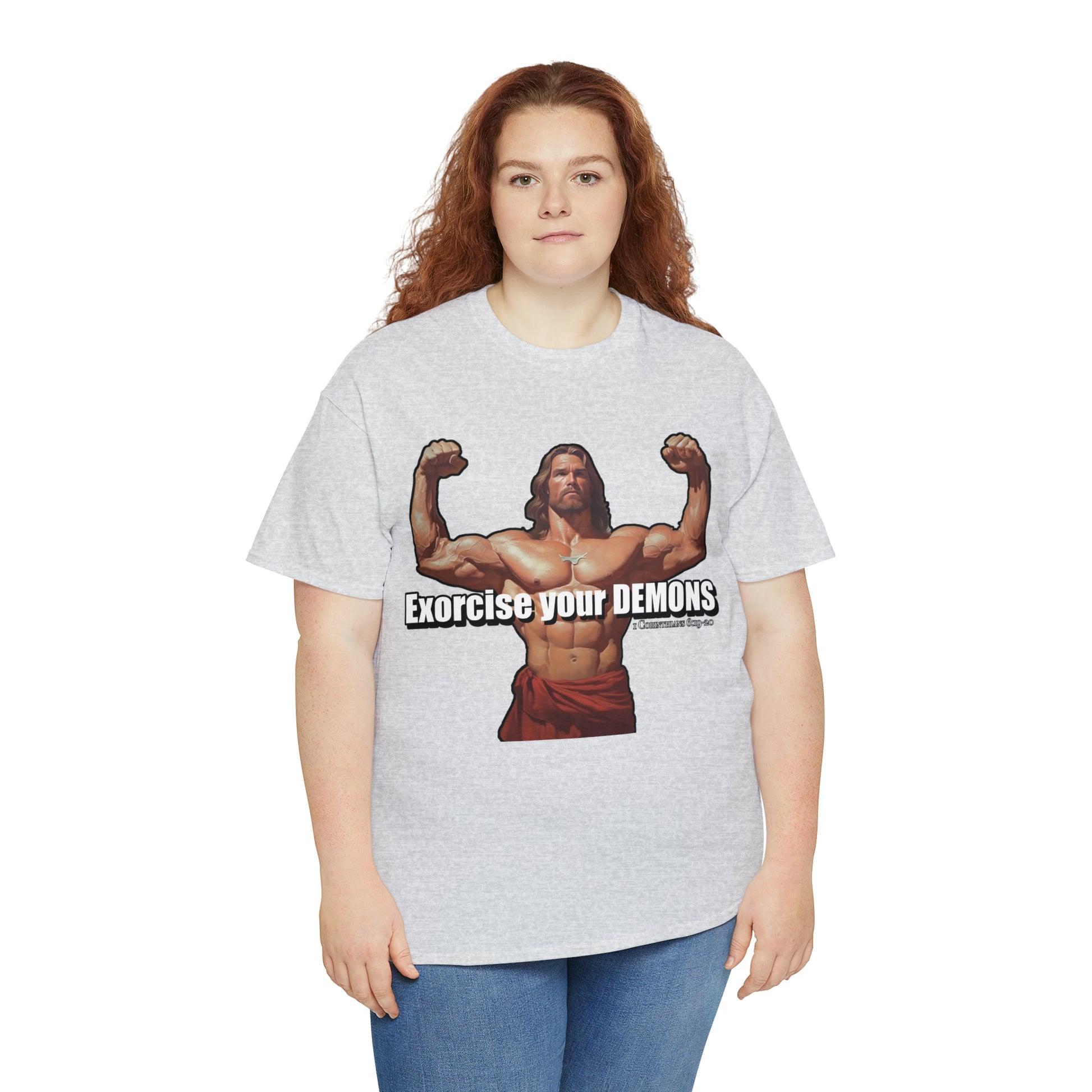 Exorcise your Demons - Body Builder Jesus Divine Strength (1 Corinthians 6:19-20) (James 2:19) Unisex Heavy Cotton Tee